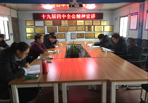 2020年1月6日,按照上級黨委的要求,市政工程項目部組織全體黨員及施工單位代表,進行貫徹十九屆四中全會精神專題宣講學習會。針對市政工程項目管理工作實際情況,部署了下一步市政項目管理部的管理工作重點,堅持以工程質量為本,安全管控為中心,成本管理為手段,落實現代化的管理理念,為建設現代化、生態化灃西新城作出市政項目管理部的貢獻。