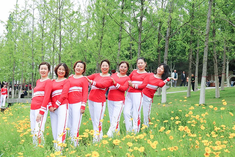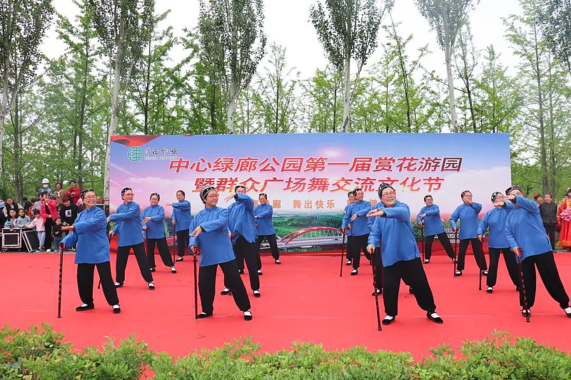 園內枝頭梢末,花兒們正鉚足勁兒爭相吐艷,在交流表演現場,廣場舞、太極拳、舞龍隊的精彩表演引得陣陣喝彩和熱烈掌聲。