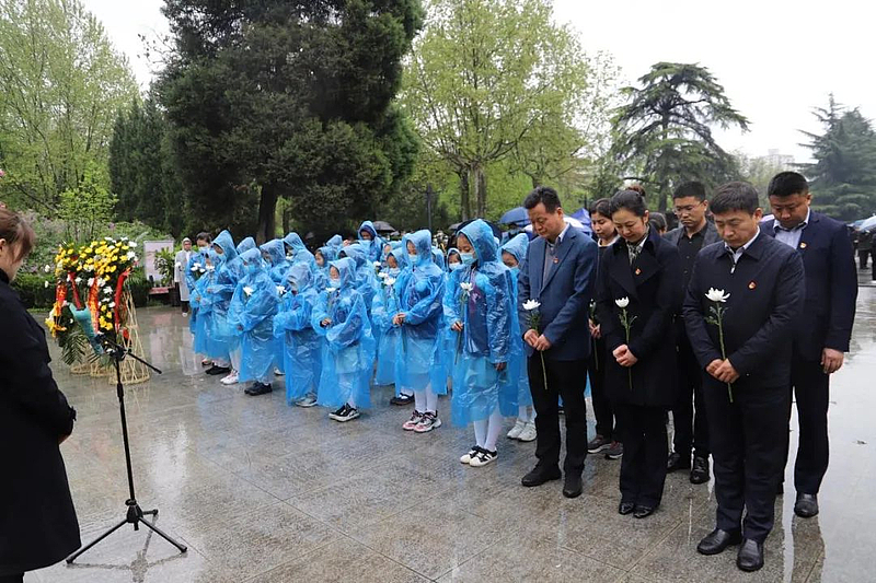 在革命烈士紀念碑前,團員、少先隊員代表手抬花籃緩步走向革命烈士紀念碑,向革命先烈敬獻花籃,投資公司和學校黨員代表整理挽聯。在一座座英雄墓碑前,全體人員向英雄烈士鞠躬默哀,并將胸前的小白花獻給英烈,表達對先烈的哀思和敬仰。